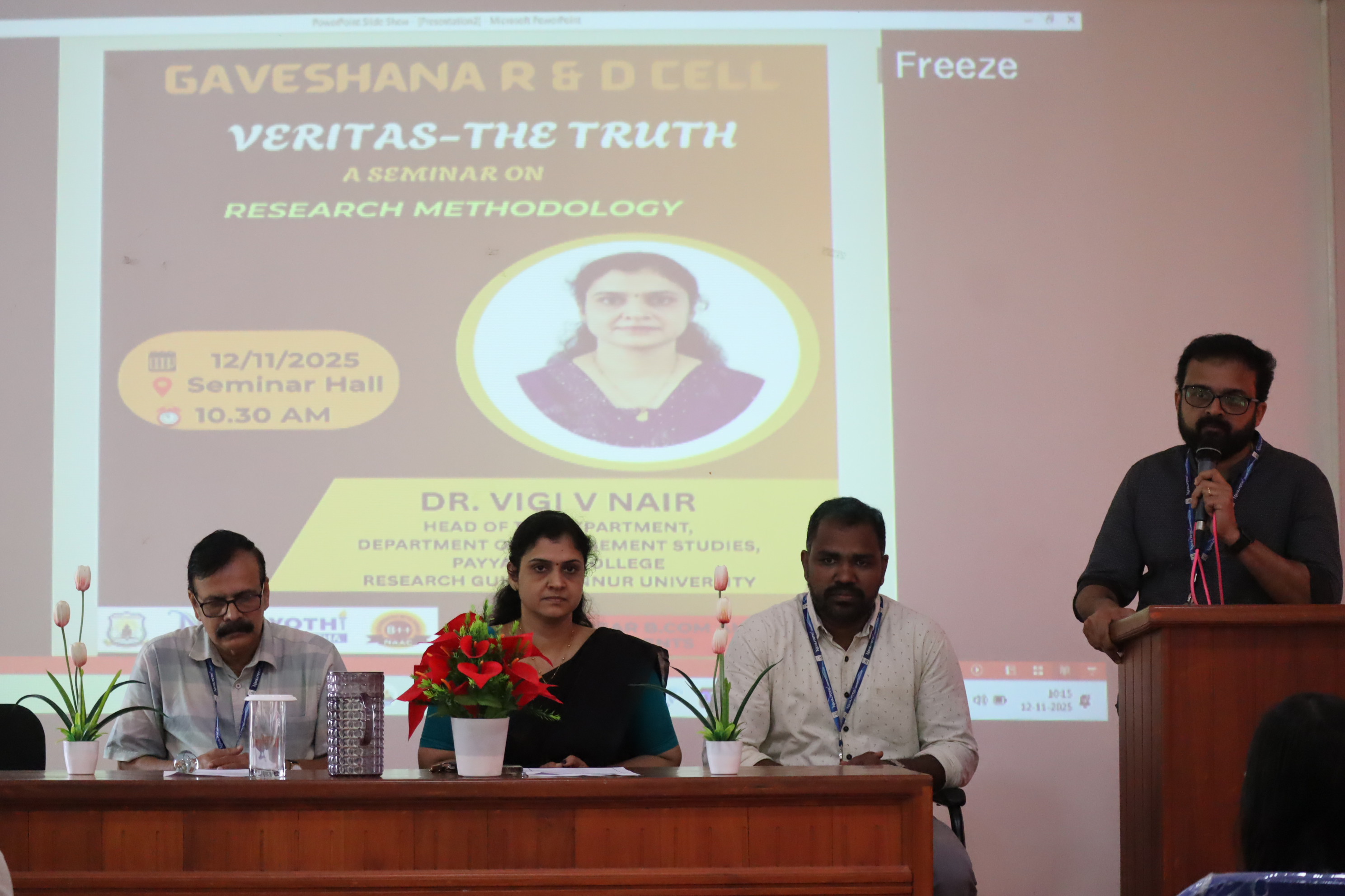 ചെറുപുഴ നവജ്യോതി കോളേജിലെ അവസാന വർഷ ബികോം, ബിബിഎ വിദ്യാർത്ഥികൾക്കായി 12/11/2025 രാവിലെ 10:30 ന് സെമിനാർ ഹാളിൽ വെച്ച് റിസർച്ച് മെതഡോളജി എന്ന ടോപ്പിക്കിൽ ഗവേഷണ ആർ &ഡി സെൽ സെമിനാർ സങ്കടിപ്പിക്കുകയുണ്ടായി.ഗവേഷണ ആർ&ഡി സെല്ലിന്റെ കൺവീനർ ശ്രീ .ഷിജോ ജോസ് സ്വാഗതപ്രസംഗം നടത്തി.കോളേജ് പ്രിൻസിപ്പൽ ഡോ.കെ കെ സോമശേഖരൻ സാർ അധ്യക്ഷ സ്ഥാനം അലങ്കരിച്ചു.നവജ്യോതി കോളേജ് ഡയറക്ടർ ഫാ.സിജോയ് പോൾ പരിപാടി ഉത്ഘാടനം ചെയ്ത് സംസാരിച്ചു. തുടർന്ന് പരിപാടിയുടെ വിശിഷ്ടാതിഥി ആയെത്തിയ പയ്യന്നൂർ കോളേജ് മാനേജ്മെന്റ് സ്റ്റഡീസ് ഡിപാർട്ട്മെന്റ് ഹെഡ് ഡോ. വിജി വി നായർ വിദ്യാർത്ഥികൾക്ക് ക്ലാസ്സെടുത്തു. ആറാം സെമസ്റ്ററിലെ അതിപ്രധാനമായ പ്രോജക്ട് റിപ്പോർട്ട് എങ്ങനെ തയ്യാറാക്കാം എന്നായിരുന്നു ക്ലാസിന്റെ വിഷയം. അവസാന വർഷ ബിബിഎ വിദ്യാർത്ഥി അക്ഷര രഘു നന്ദി പറഞ്ഞു .
