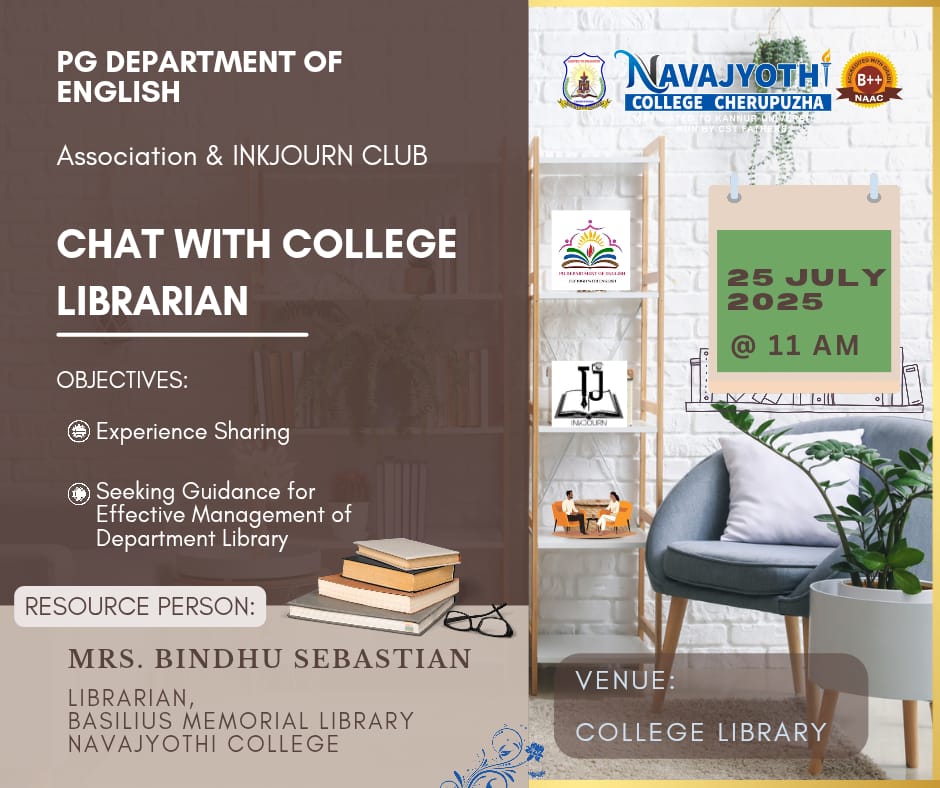 നവജ്യോതി: നവജ്യോതി കോളേജ് ലൈബ്രേറിയൻ ബിന്ദു സെബാസ്റ്റ്യനുമായി ഇംഗ്ലീഷ് വിഭാഗം മൂന്നാം വർഷ ബിരുദ വിദ്യാർത്ഥികൾ അഭിമുഖ സംഭാഷണം നടത്തി.'ചാറ്റ് വിത്ത് ലൈബ്രേറിയൻ' എന്നതിലൂടെ ബിന്ദു സെബാസ്റ്റ്യൻ വിദ്യാർഥികൾക്കും അധ്യാപകർക്കും ഒരു ലൈബ്രറിയുടെ തുടക്കം എങ്ങനെ എന്ന ആശയത്തെക്കുറിച്ച് അറിവുകൾ നൽകി. ഇംഗ്ലീഷ് വിഭാഗം ലൈബ്രറിയുടെ മെച്ചപ്പെടുത്തലുകൾക്ക് ഉപകാരപ്രദമാകും വിധമാണ് ലൈബ്രേറിയന്റെ അഭിമുഖം. വിദ്യാർത്ഥികളുടെ സംശയത്തെ പരിഹരിച്ച് നൽകാനും ഈ പരിപാടിയിലൂടെ ലൈബ്രേറിയിന് സാധിച്ചു. ഇംഗ്ലീഷ് വിഭാഗം എച്ച് ഒ ഡി ആതിര സി വി, അധ്യാപകർ നമിത മാത്യു, കരോളിൻ മരിയ എന്നിവർ പരിപാടിക്ക് നേതൃത്വം നൽകി.
