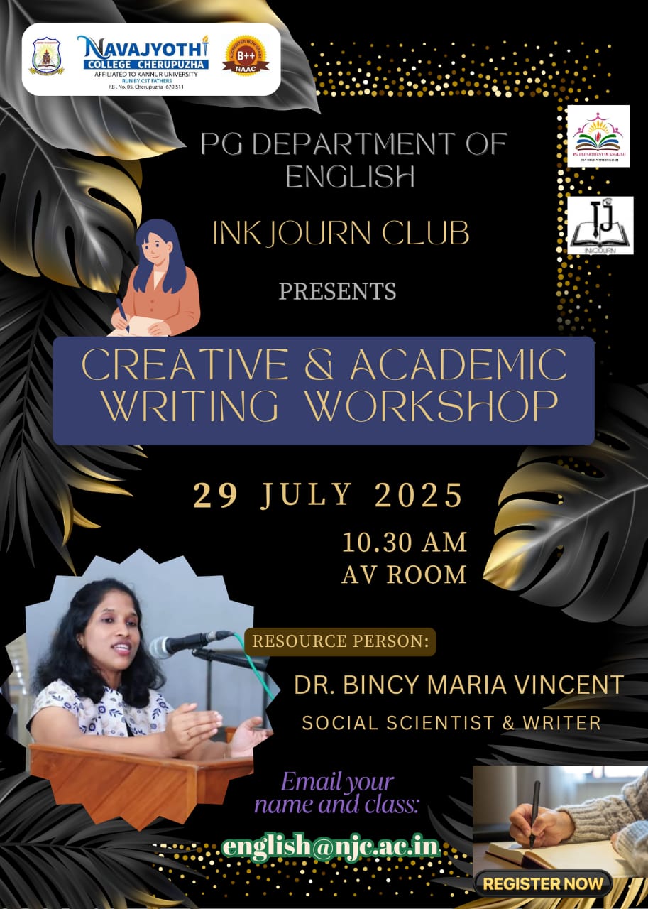 പി.ജി ഡിപ്പാർട്മെന്റ് ഓഫ് ഇംഗ്ലീഷ് ,ഇങ്ക്ജെൺ ക്ലബ് വിദ്യാർത്ഥികൾക്കായി 'ക്രീയേറ്റീവ് ആൻഡ് അക്കാഡമിക് റൈറ്റിംഗ് വർക്ഷോപ്' സംഘടിപ്പിച്ചു . സോഷ്യൽ സയന്റിസ്റ്റും എഴുത്തുകാരിയും ആയ ഡോ .ബിൻസി മരിയ വിൻസെന്റ് ക്ലാസ്സുകൾക്ക് നേതൃത്വം നൽകി.