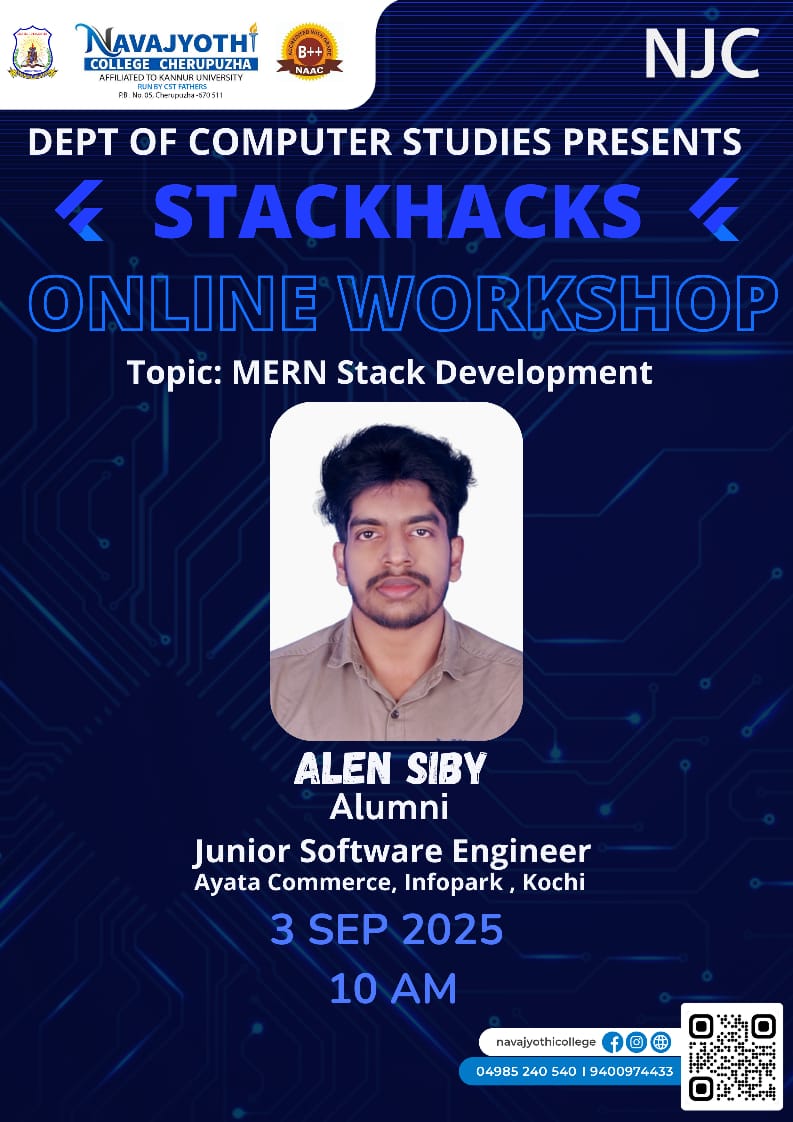 നവജ്യോതി കോളേജ് കമ്പ്യൂട്ടർ സ്റ്റഡീസ് വിഭാഗത്തിന്റെ ആഭിമുഖ്യത്തിൽ MERN STACK DEVELOPMENT എന്ന വിഷയത്തിൽ 'STACKHACKS ' എന്ന പേരിൽ ഓൺലൈൻ വർക്ഷോപ് സംഘടിപ്പിച്ചു. പൂർവ്വ വിദ്യാർത്ഥിയും നിലവിൽ ഇൻഫോപാർക്കിൽ Ayatta Commerce എന്ന കമ്പനിയിൽ ജൂനിയർ സോഫ്റ്റ്വെയർ ആയി ജോലിചയ്യുന്ന അലൻ സിബിയാണ് റിസോഴ്സ് പേഴ്സനായി എത്തിയത് .