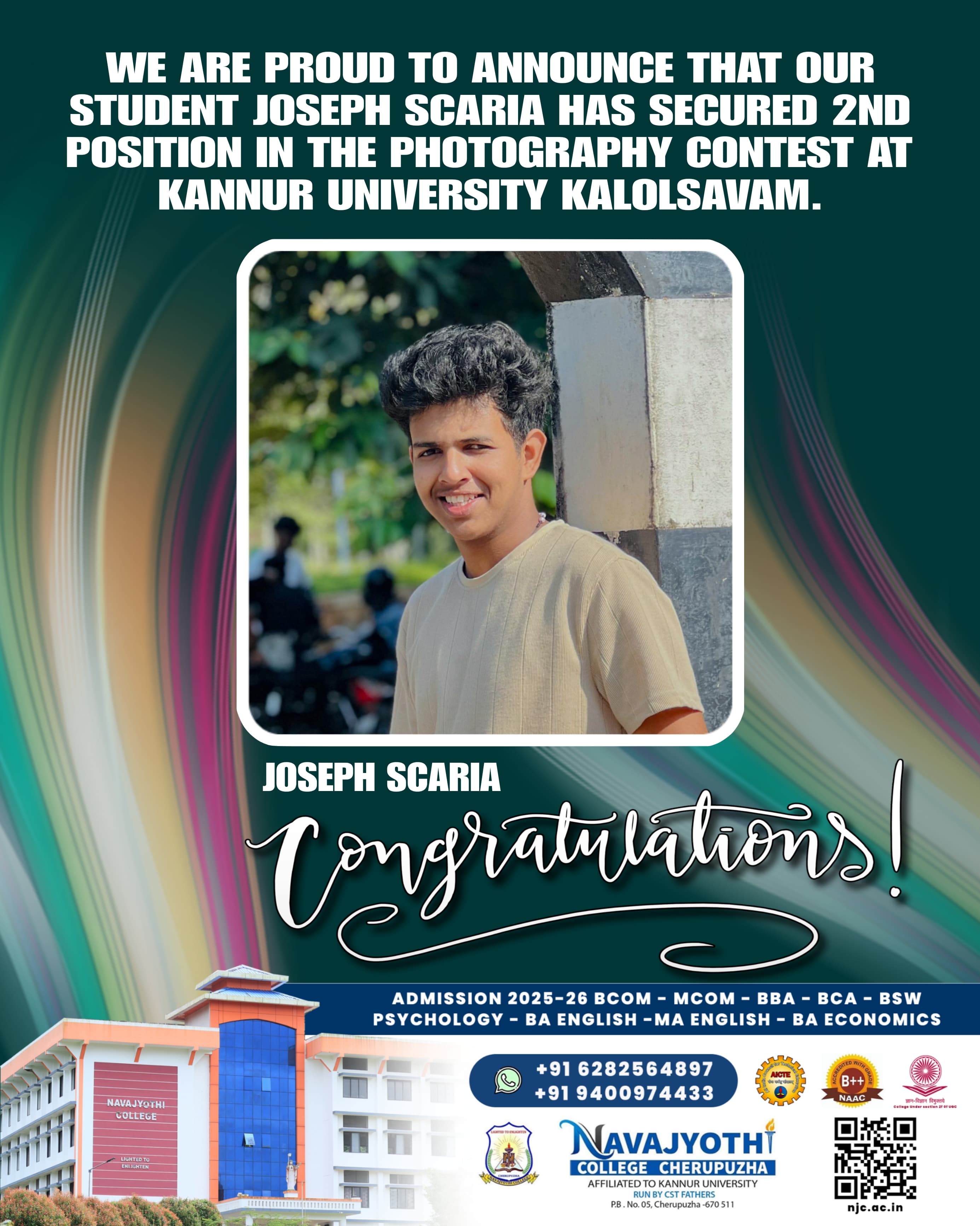 കണ്ണൂർ യൂണിവേഴ്സിറ്റി കലോത്സവത്തിൽ ഫോട്ടോഗ്രഫി മത്സരത്തിൽ രണ്ടാം സ്ഥാനം കരസ്ഥമാക്കിയ ജോസഫ് സ്കറിയയ്ക്ക് അഭിനന്ദനങ്ങൾ....