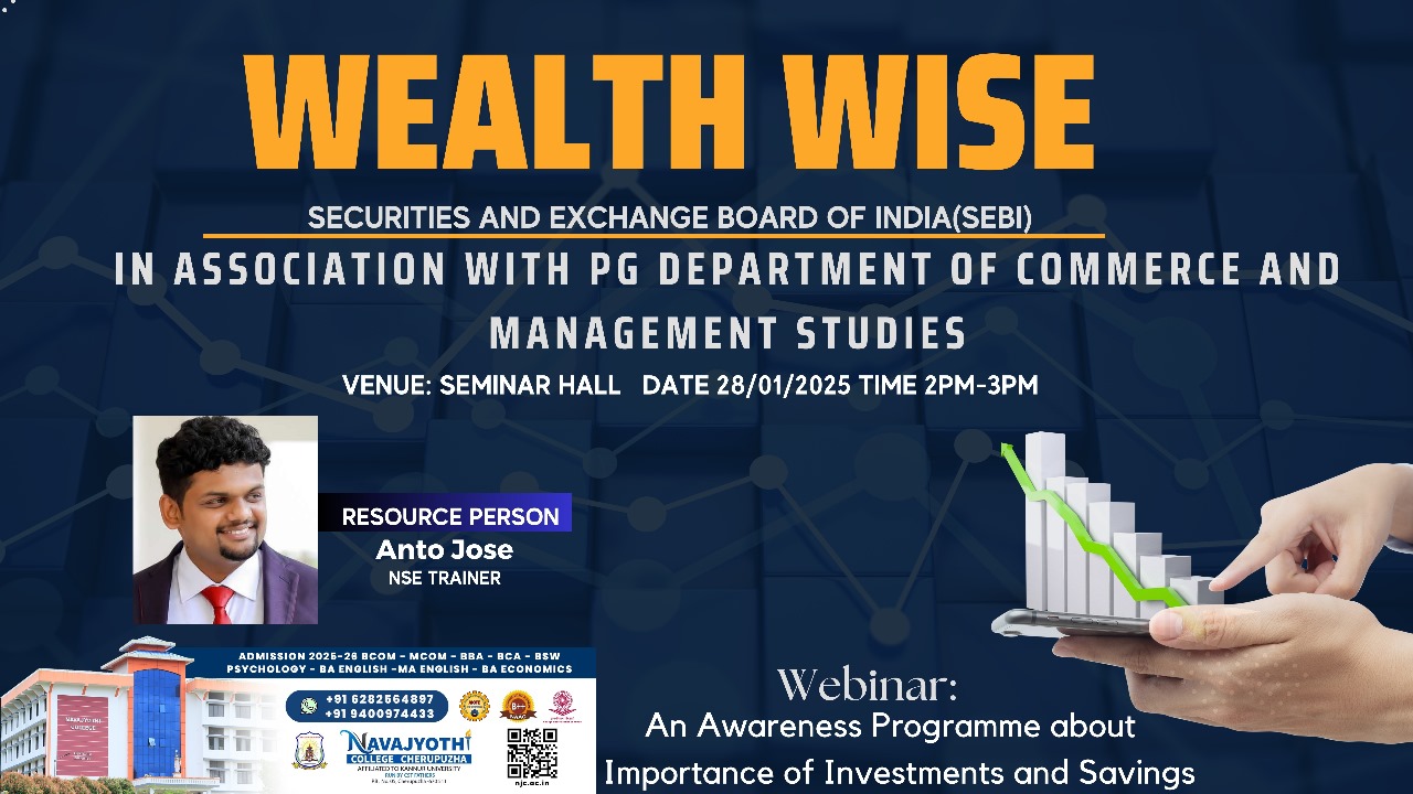 WEALTH WISE എന്ന പേരിൽ സെക്യൂരിറ്റീസ് ആൻഡ് എക്സ്ചേഞ്ച് ബോർഡ് ഓഫ് ഇന്ത്യ (SEBI )യും , പി ജി ഡിപ്പാർട്ടമെന്റ് ഓഫ് കോമേഴ്സും ഡിപ്പാർട്ടമെന്റ് ഓഫ് മാനേജ്മെന്റ് സ്റ്റഡീസും സംയുക്തമായി ഒരു വെബ്ബിനാർ (An Awareness Programme about Importance of Investments and Savings) സംഘടിപ്പിച്ചു. NSE ട്രെയിനർ ശ്രീ. ആന്റോ ജോസ് ക്ലാസ്സിന് നേതൃത്വം നൽകി.