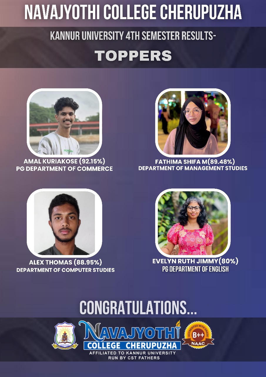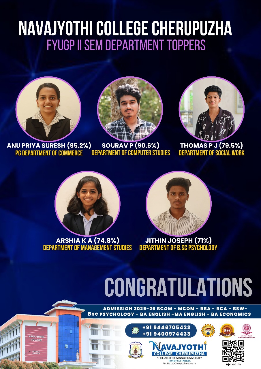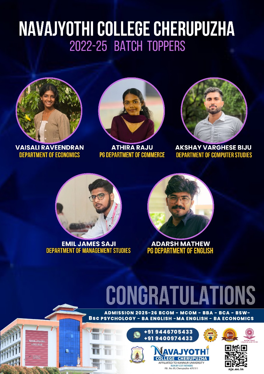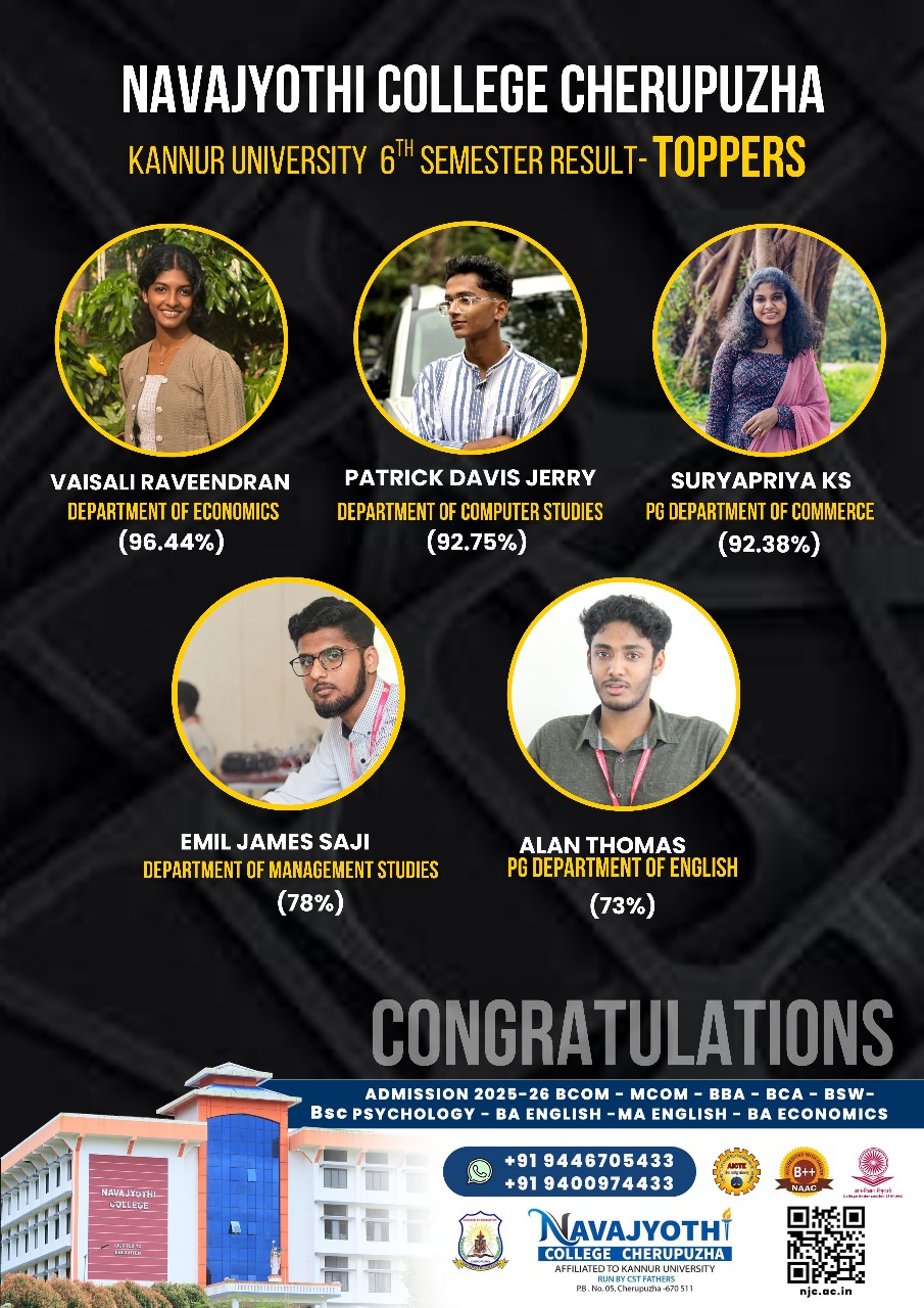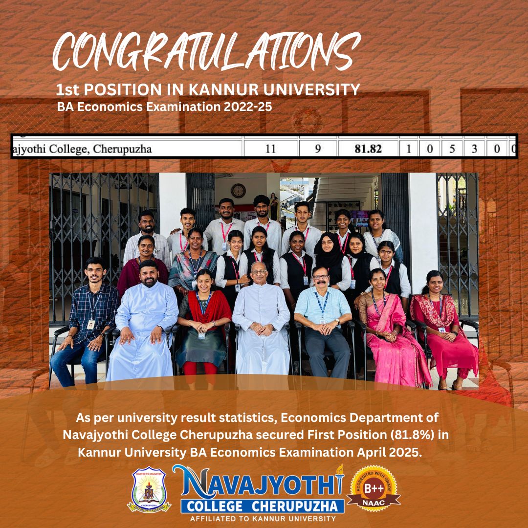 As per university result statistics, Economics Department of Navajyothi College Cherupuzha secured First Position (81.8%) in Kannur University BA Economics Examination April 2025.