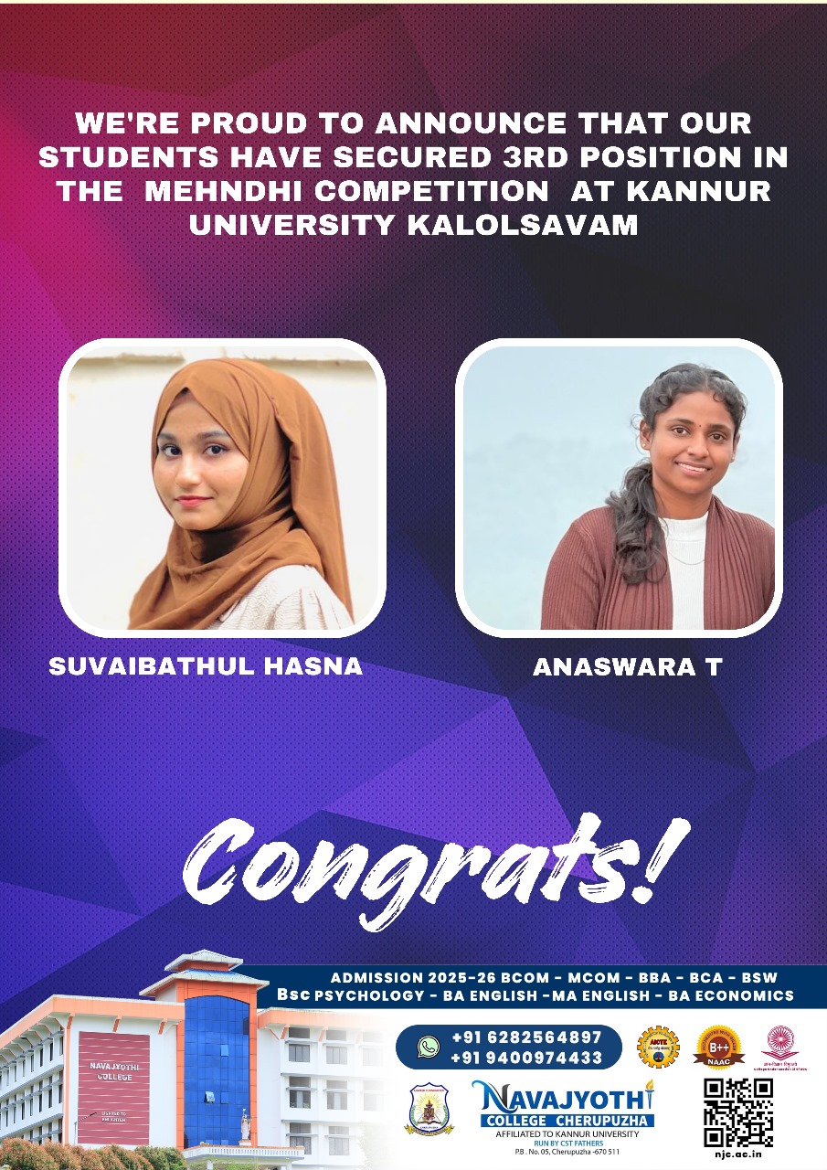 2024-25 വർഷത്തെ നവജ്യോതി വുമൺ പുരസ്കാരത്തിന് മൂന്നാം വർഷ ഇക്കണോമിക്സ് വിഭാഗം വിദ്യാർത്ഥിനി വൈശാലി രവീന്ദ്രൻ അർഹയായി.
