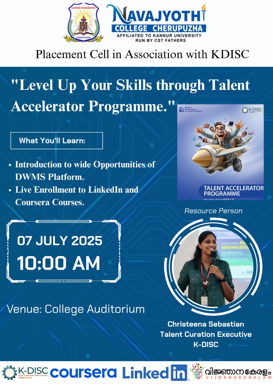 നവജ്യോതി കോളേജ് പ്ലേസ്മെന്റ് സെല്ലും കെ-ഡിസ്ക് സംയുക്തമായി വിദ്യാർത്ഥികൾക്കായി "Level up your Skills through Talent Accelerator Programme" സംഘടിപ്പിച്ചു .കോളേജ് ഓഡിറ്റോറിയത്തിൽ വച്ച് സംഘടിപ്പിച്ച പരിപാടിയിൽ ടാലെന്റ് ക്യൂറേഷൻ എക്സിക്യൂട്ടീവ് മിസ് ക്രിസ്റ്റീന സെബാസ്റ്റ്യൻ ക്ലാസ്സുകൾക് നേതൃത്വം നൽകി.