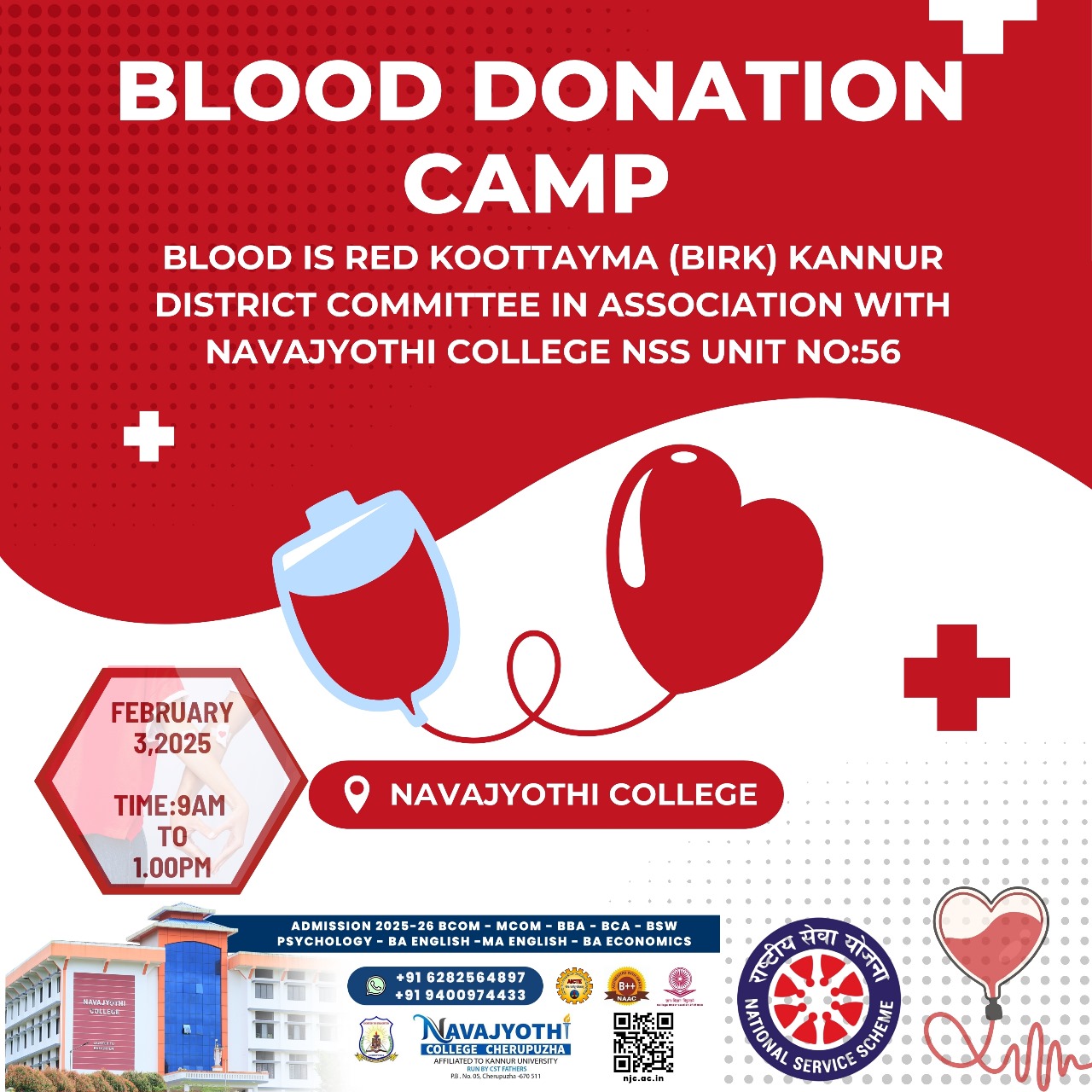 Blood is Red കൂട്ടായ്മ (BIRK) കണ്ണൂർ ജില്ലാ കമ്മിറ്റി, നവജ്യോതി കോളേജ് എൻ.എസ്. എസ് യുണിറ്റ് നമ്പർ 56 ഉം സംയുക്തമായി ഫെബ്രുവരി 3-ാം തീയ്യതി കോളേജ് സെമിനാർ ഹാളിൽ വച്ച് രക്തദാന ക്യാമ്പ് സംഘടിപ്പിച്ചു .