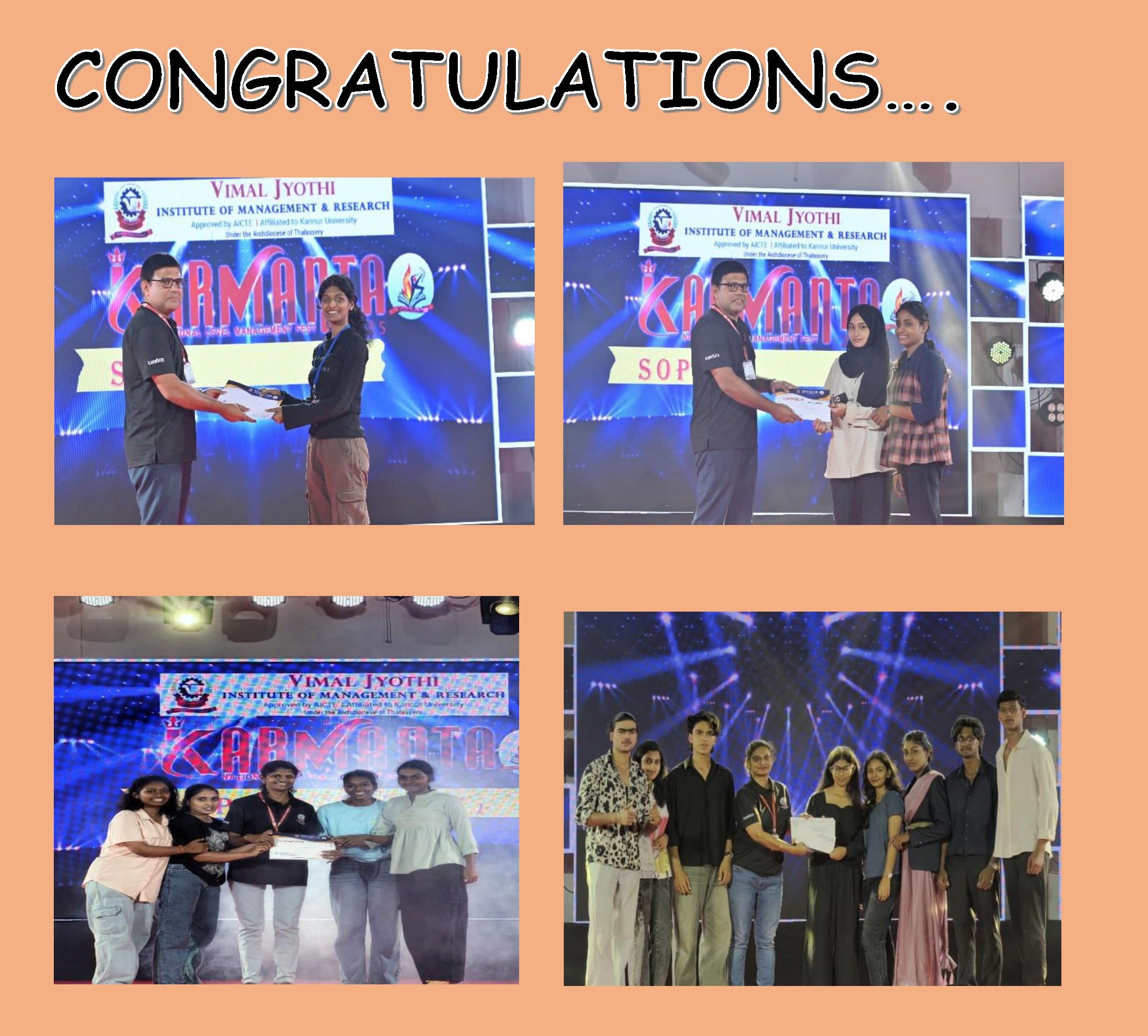 വിമൽജ്യോതി എൻജിനീയറിങ് കോളേജിൽ വച്ചു നടന്ന 'KARMANTA 2 K 25' നാഷണൽ ലെവൽ മാനേജ്മെന്റ് ഫെസ്റ്റിൽ ഡ്രോയിങ്ങ് മത്സരത്തിൽ വൈശാലി രവീന്ദ്രൻ , മെഹന്ദി ഇടൽ മത്സരത്തിൽ സുവൈബത്തുൽ ഹസ്ന, അനശ്വര റ്റി , സിനിമാറ്റിക് ഡാൻസ് മത്സരത്തിൽ റിഞ്ചു കെ വിജയ്, സയന ജോൺ ,അൽവിന ആന്റോ, ആദിത്യ ബാബു ,ഡെൽന മരിയ, സോനാ ബിനു , സാനിയ ജോസഫ് , കോർപ്പറേറ്റ് ഫാഷൻ വാക് മത്സരത്തിൽ മുഹമ്മദ് ഷഫീഖ് ,സൂര്യ ശങ്കർ ,മുഹമ്മദ് സഫ്വാൻ, എവ് ലിൻ റൂത് , ഡെബോറ ജോയി, അന്നമോൾ, മുഹമ്മദ് ഷാമിൽ,ആൽബർട്ട് ജോർജ് തുടങ്ങിയ വിദ്യാർത്ഥികൾ മികച്ച വിജയം കരസ്ഥമാക്കി.