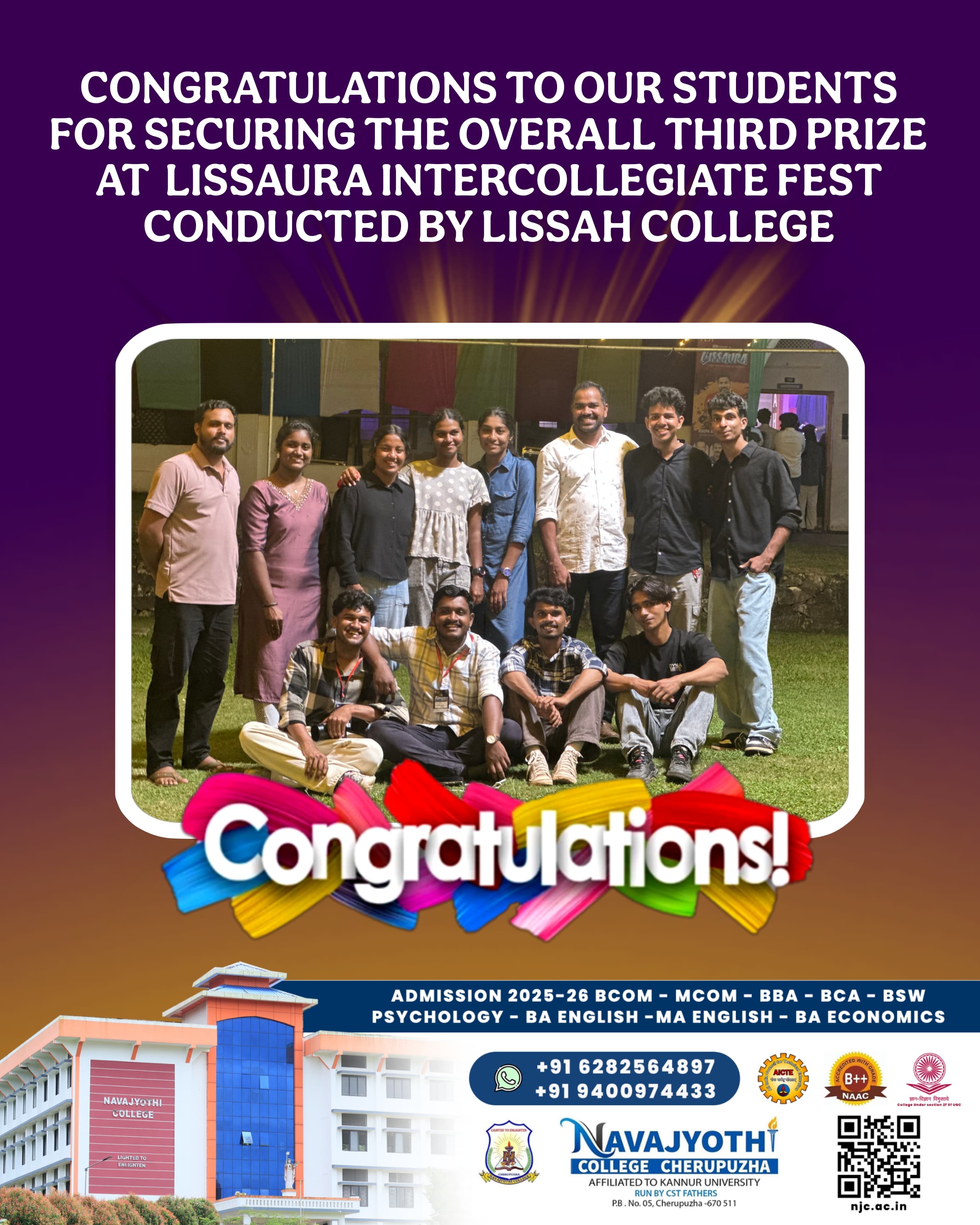 ലിറ്റിൽ ഫ്ലവർ ഇൻസ്റ്റിറ്റ്യൂട്ട് ഓഫ് സോഷ്യൽ സയൻസ് ആൻഡ് ഹെൽത് (LISSAH) കൈതപൊയിൽ , കോഴിക്കോട് വച്ച് നടന്ന ഇന്റർ കോളേജിയറ്റ് ഫെസ്റ്റിൽ (LISSAURA '25 ) ഓവർഓൾ മൂന്നാം സ്ഥാനം കരസ്ഥമാക്കി നവജ്യോതി കോളേജ്...