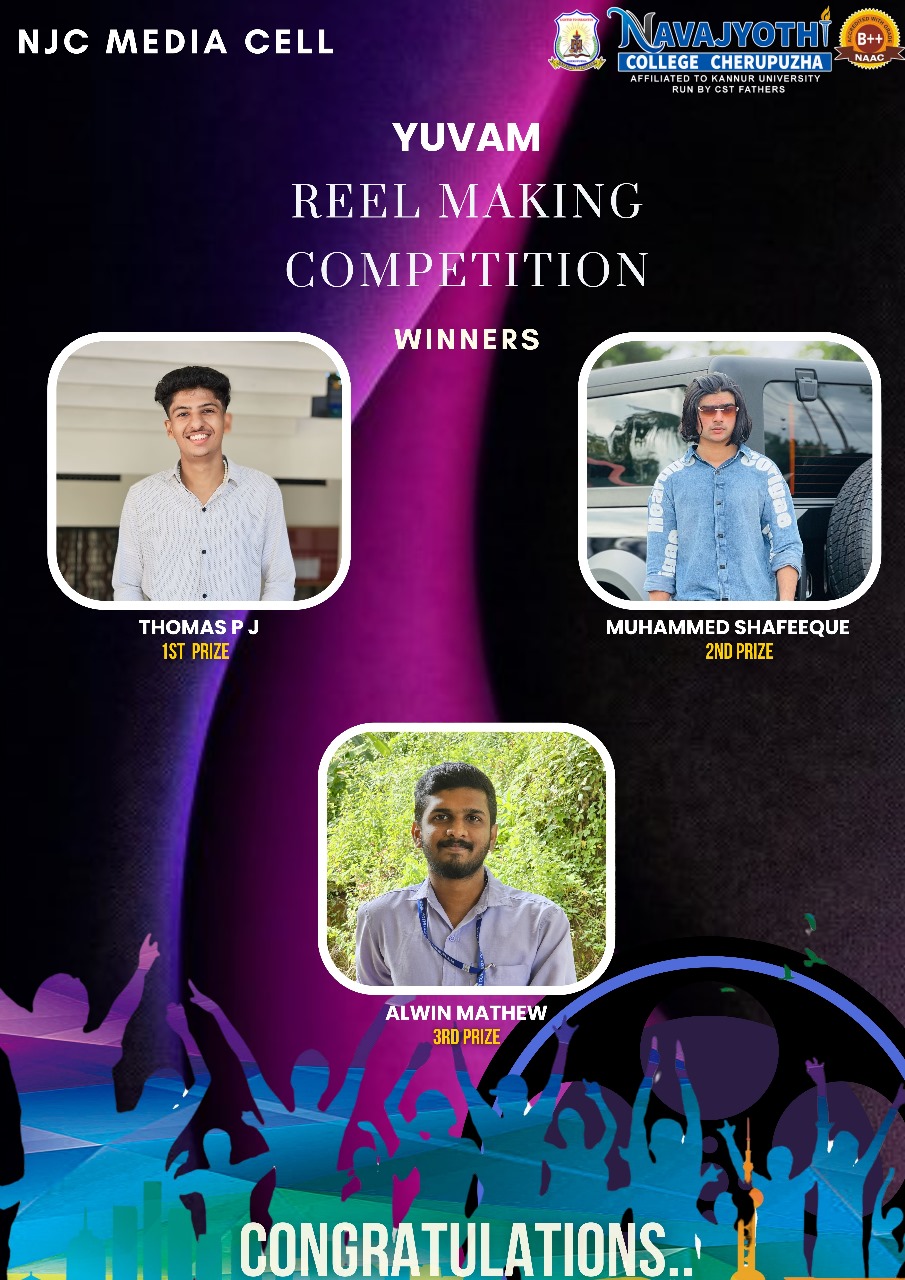 YUVAM നവജ്യോതി കോളേജ് മീഡിയ സെൽ, ARMADA കോളേജ്ഡേയോട് അനുബന്ധിച്ചു നടത്തിയ റീൽ മേക്കിങ് മത്സരത്തിൽ വിജയികളായ തോമസ് പി ജെ , മുഹമ്മദ് ഷെഫീഖ് , ആൽവിൻ മാത്യു എന്നിവർക്ക് അഭിനന്ദനങ്ങൾ ....