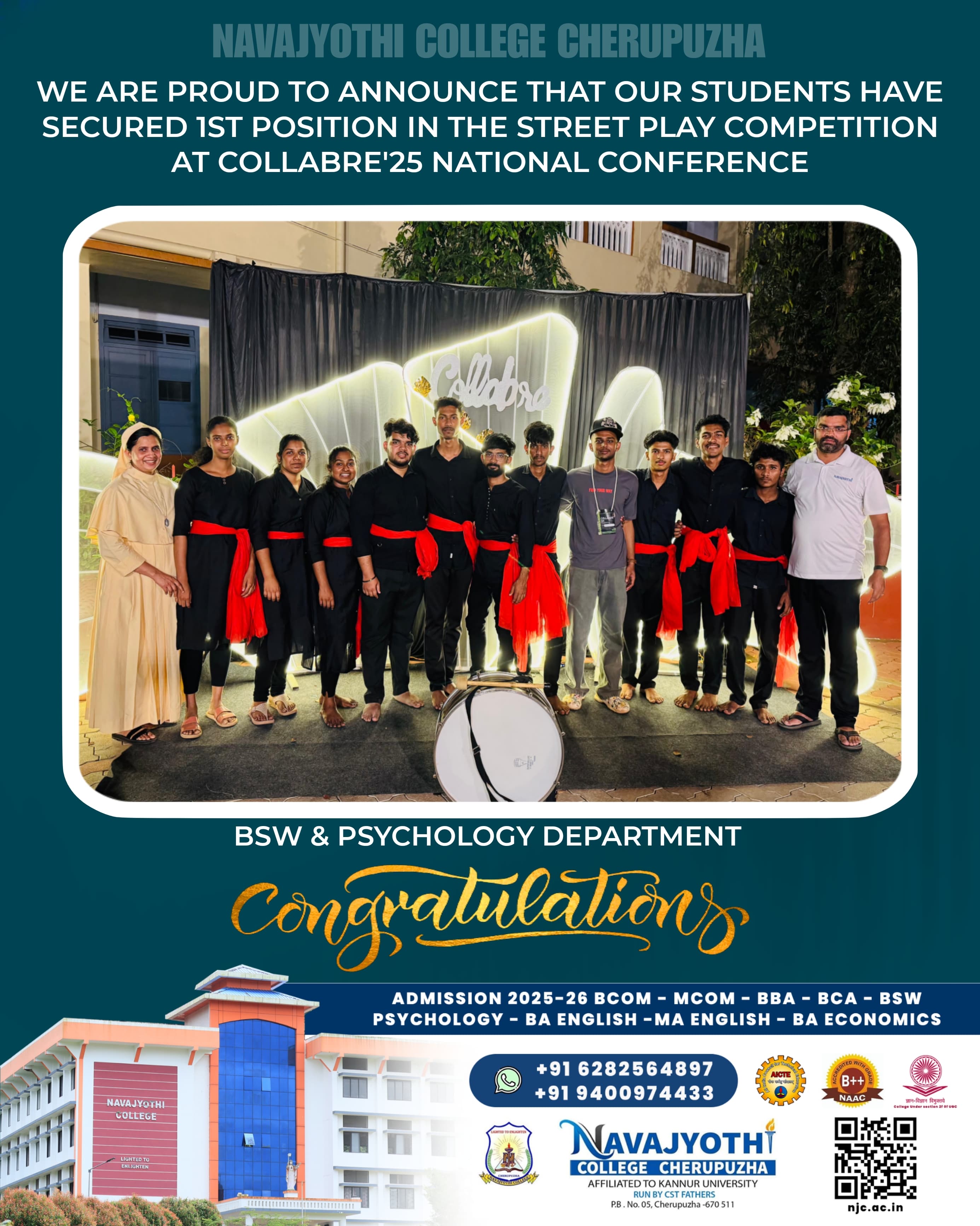 ദേവഗിരി കോളേജിൽ വച്ച് നടന്ന ദേശീയ സെമിനാറിന്റെ (COLLABRE '25) ഭാഗമായി നടത്തിയ തെരുവ് നാടക മത്സരത്തിൽ ഒന്നാം സ്ഥാനം (കാടിന്റെ പാട്ട്) കരസ്ഥമാക്കി നവജ്യോതി കോളേജിലെ ബി.എസ്സി സൈക്കോളജി, സോഷ്യൽ വർക്ക് ഡിപ്പാർട്മെന്റിലെ കുട്ടികൾ....