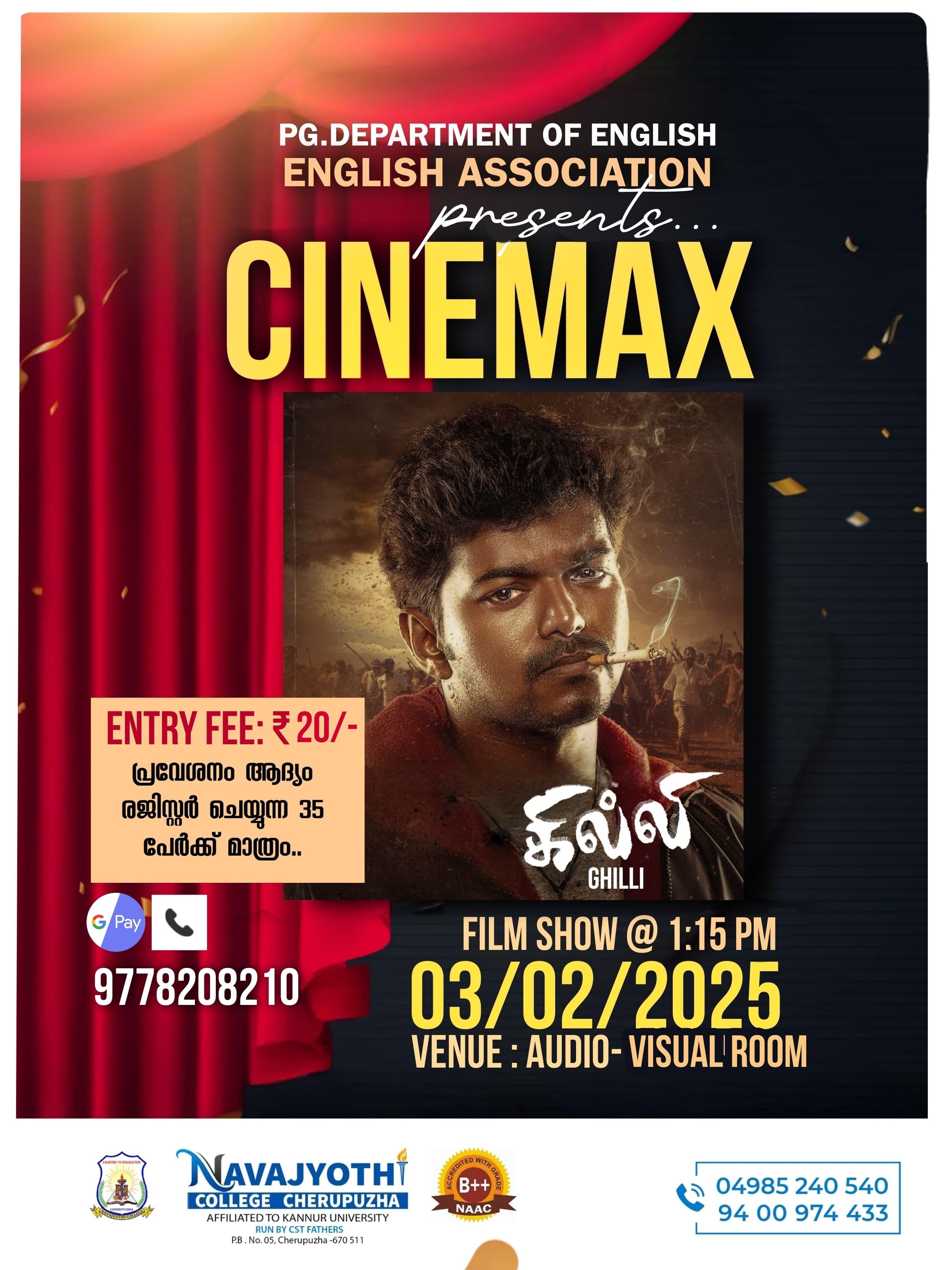 പി ജി ഡിപ്പാർട്ടമെന്റ് ഓഫ് ഇംഗ്ലീഷ് കോളേജ് ഓഡിയോ വിഷ്വൽ റൂമിൽ വച്ച് വിദ്യാർത്ഥികൾക്കായി 'CINEMAX' എന്നപേരിൽ സിനിമ പ്രദർശനം സംഘടിപ്പിച്ചു .