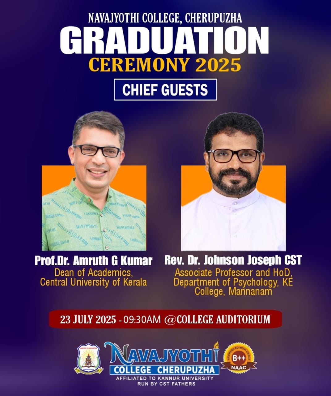 ചെറുപുഴ നവജ്യോതി കോളേജിൽ 2022-25 വർഷത്തെ ബിരുദം നേടിയവർക്കായി ബിരുദദാന ചടങ്ങ് സംഘടിപ്പിച്ചു. സെൻട്രൽ യൂണിവേഴ്സിറ്റി ഓഫ് കേരള സ്കൂൾ ഓഫ് എഡ്യൂക്കേഷൻ പ്രൊഫസർ ഡോ. അമൃത് ജി കുമാറും , മാന്നാനം കെ ഇ കോളേജ് സൈക്കോളജി വിഭാഗം മേധാവിയും,അസോസിയേറ്റ് പ്രൊഫസറുമായ റവ. ഡോ. ജോൺസൺ ജോസഫ് സി. എസ്. റ്റിയും വിശിഷ്ടാതിഥിയായ ചടങ്ങിൽ നവജ്യോതി കോളേജ് മാനേജർ ഫാ. ജോസഫ് ചാത്തനാട്ട് സി. എസ്. റ്റി, ഡയറക്ടർ ഫാ. സിജോയ് പോൾ സി എസ് റ്റി, പ്രിൻസിപ്പൽ ഡോ. കെ. കെ സോമശേഖരൻ സർ, വൈസ് പ്രിൻസിപ്പൽ ഫാ. ജോസ് താമരക്കാട്ട് സി. എസ്. റ്റി, ബർസാർ ഫാ.അരുൺ പി ജെയിംസ് സി. എസ്. റ്റി, ഡിപ്പാർട്മെന്റ് മേധാവികൾ എന്നിവർ വേദി അലങ്കരിച്ചു.ബിരുദ ദാന ചടങ്ങിനോടൊപ്പം, പാഠ്യ വിഷയങ്ങളിൽ മികവ് പുലർത്തുന്ന വിദ്യാർത്ഥികൾക്കായുള്ള നവജ്യോതി എക്സലൻസ് അവാർഡ്, മഹാത്മാഗാന്ധി അവാർഡ്, കലാ-കായിക മത്സരങ്ങളിൽ മികവ് പുലർത്തുന്ന വിദ്യാർത്ഥികൾക്കായുള്ള ലിറ്റിൽ ഫ്ലവർ അച്ചീവേഴ്സ് എൻഡോമെന്റ്, കമ്പ്യൂട്ടർ ആപ്ലിക്കേഷൻ വിഭാഗത്തിൽ മികവ് പുലർത്തിയ വിദ്യാർഥിക്കായുള്ള ബിറ്റ്സ് ഫ്ലേർ അവാർഡ് എന്നിങ്ങനെ നിരവധി അവാർഡുകളും പ്രസ്തുത ചടങ്ങിൽ നൽകി. വിദ്യാർത്ഥികളോടൊപ്പം കുടുംബാംഗങ്ങളും അധ്യാപകരും മറ്റു വിദ്യാർത്ഥികളും പങ്കുചേർന്നതോടെ ബിരുദദാന ചടങ്ങ് മനോഹരമായി. മൂന്നു വർഷത്തെ വിദ്യാർത്ഥികളുടെ പ്രയത്നവും അധ്യാപകർ പകർന്നു നൽകിയ അറിവുമെല്ലാം പാഠ്യ വിഷയങ്ങളിൽ മുന്നേറുക മാത്രമല്ല, പാഠ്യേതര വിഷയങ്ങളിലും വ്യക്തിത്വ വികാസത്തിനും ഏറെ സഹായിച്ചുവെന്നും, നവജ്യോതി നൽകിയ ഓർമ്മകൾ ഹൃദയത്തിൽ ചേർത്തുവെക്കുമെന്നും വിദ്യാർത്ഥികൾ നന്ദി പ്രസംഗത്തിൽ പറഞ്ഞു.