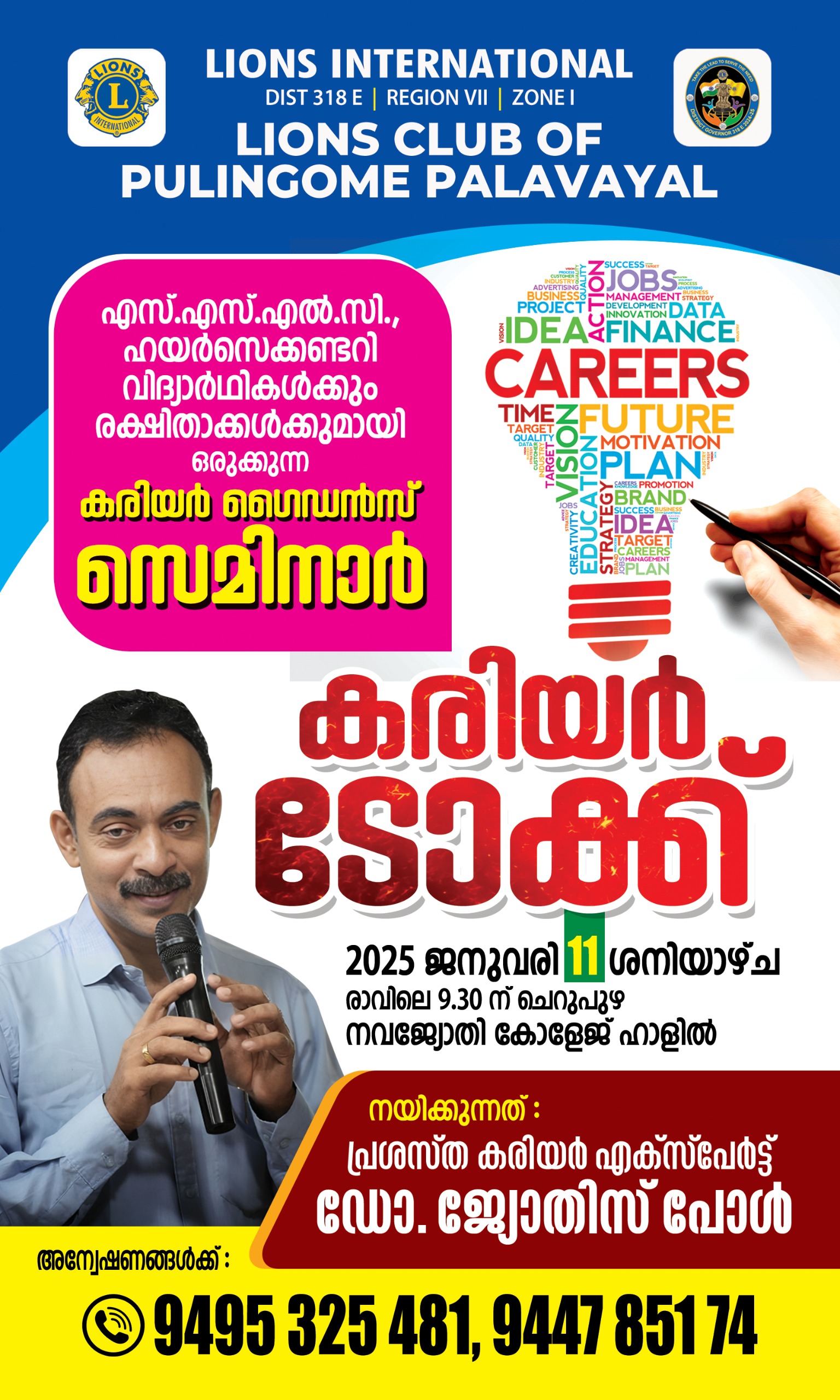 11 -01 -2025 ശനിയാഴ്ച്ച നവജ്യോതി കോളേജിൽ വച്ച് ലയൺസ് ക്ലബ്ബിന്റെ നേതൃത്വത്തിൽ എസ് .എസ് .എൽ.സി , ഹയർ സെക്കണ്ടറി വിദ്യാർത്ഥികൾക്കും രക്ഷിതാക്കൾക്കുമായി കരിയർ ഗൈഡൻസ് ക്ലാസ് നടത്തി .